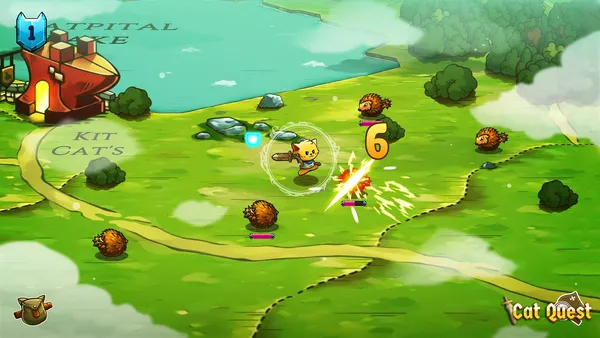 The search for the sorcerer Drakoth in Cat Quest spans Felingard, an overworld map designed like a physical tabletop board. Combat starts directly on the paths and fields as you roll past red damage indicators before countering with blades and magic. These encounters occur constantly while navigating from coastal ruins to frozen peaks to rescue your kidnapped sister.