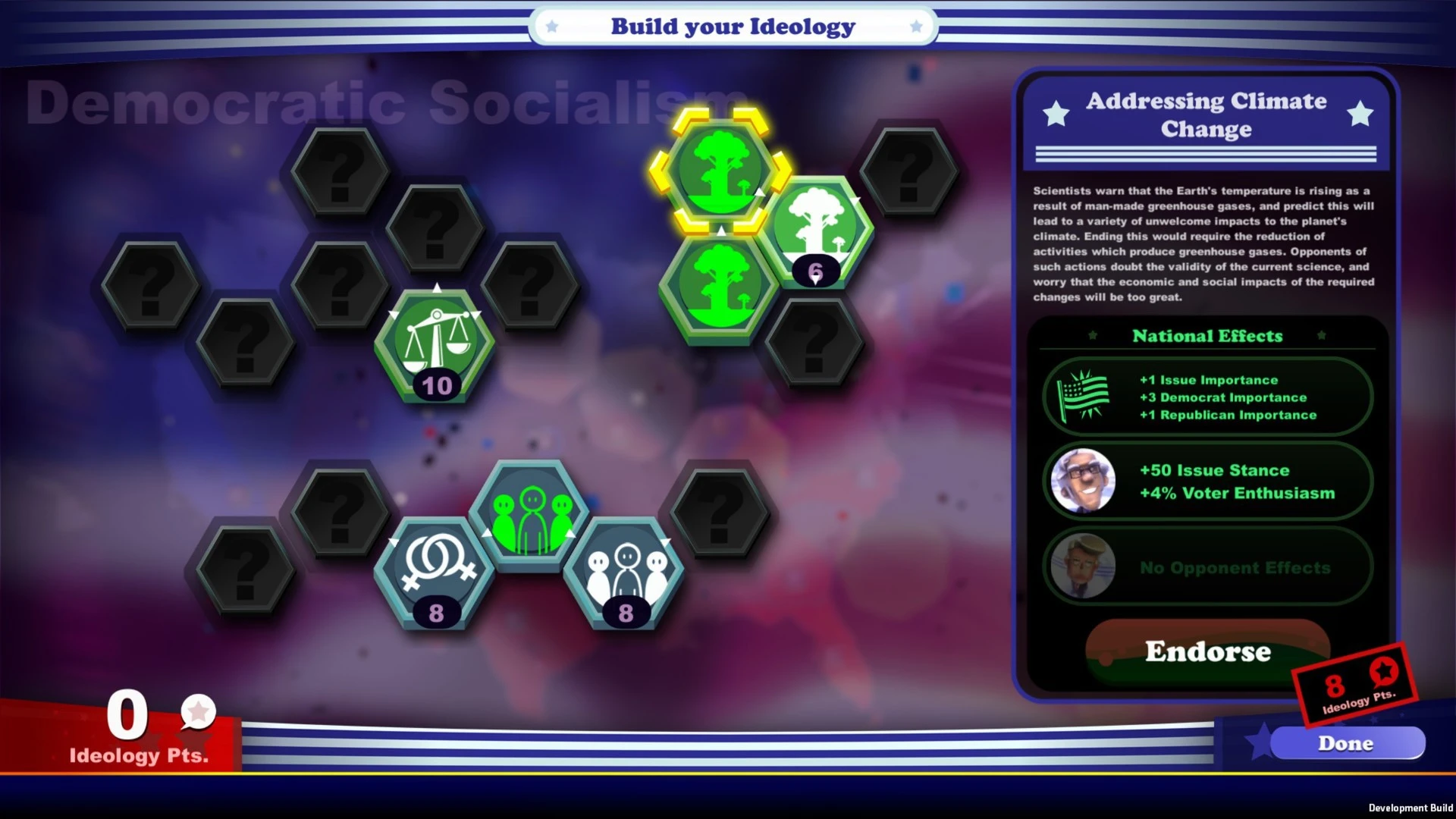 - Craft detailed candidate profiles, adjusting stances on dozens of real-world issues.