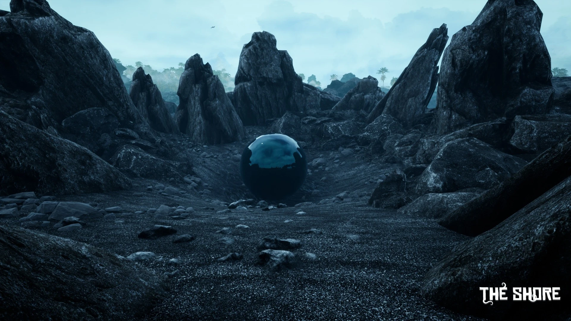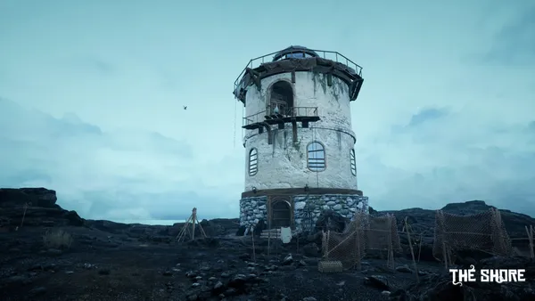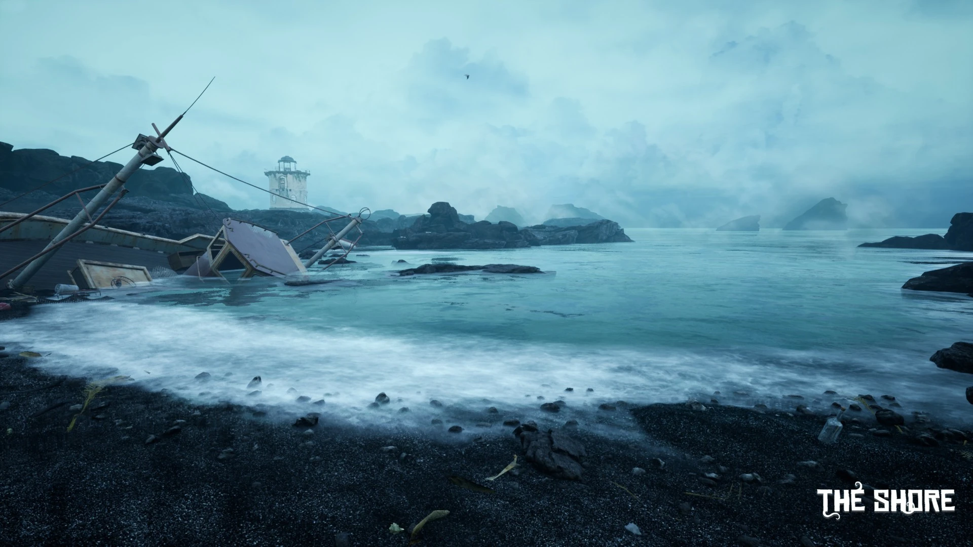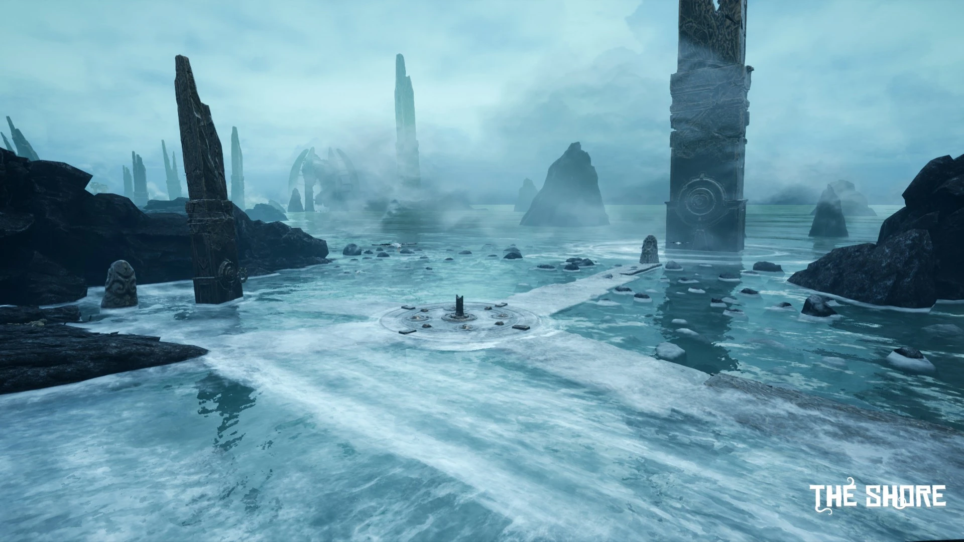 A forgotten island looms shrouded in aggressive fog; its strange ruins hint at a vanished, advanced civilization you seek to understand. Standing on the shore, you finally confront this unsettling landscape where untamed nature actively works against your investigation.