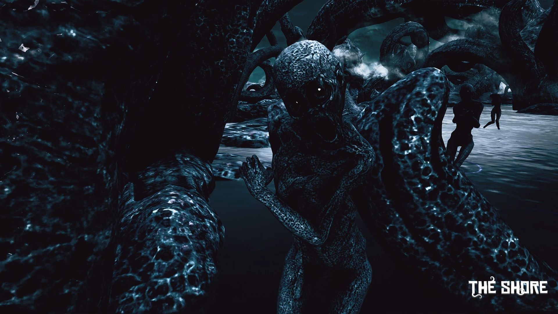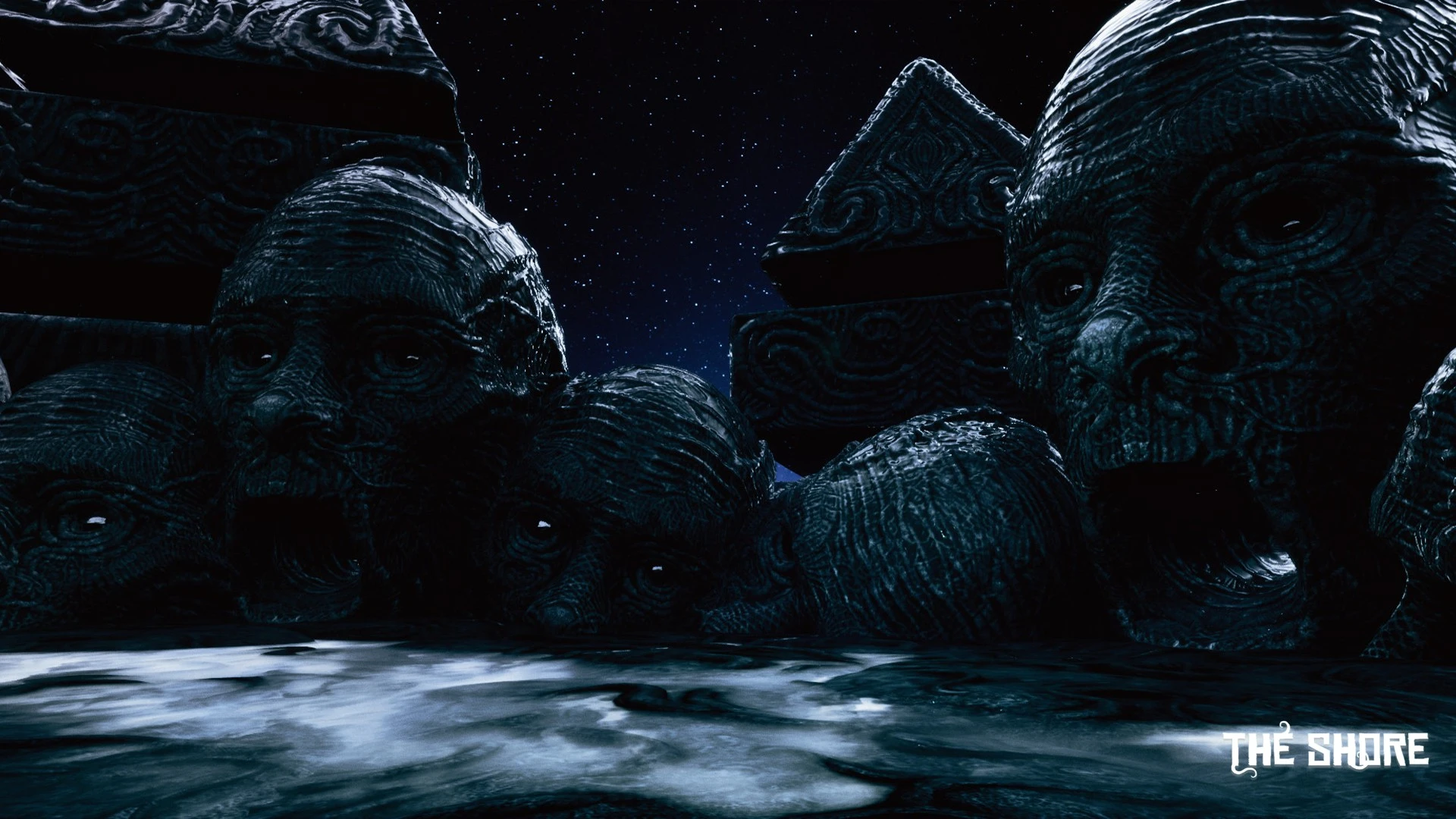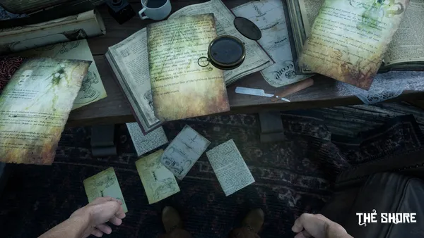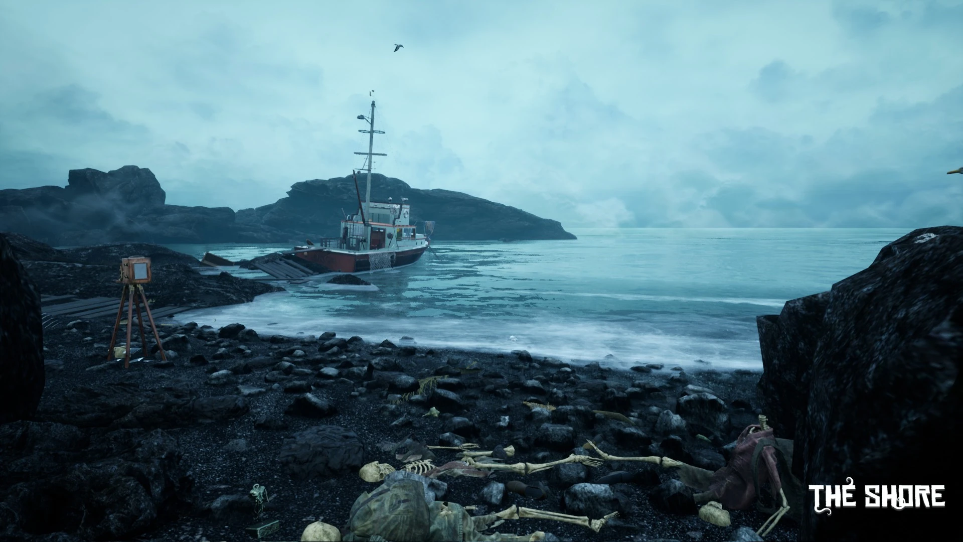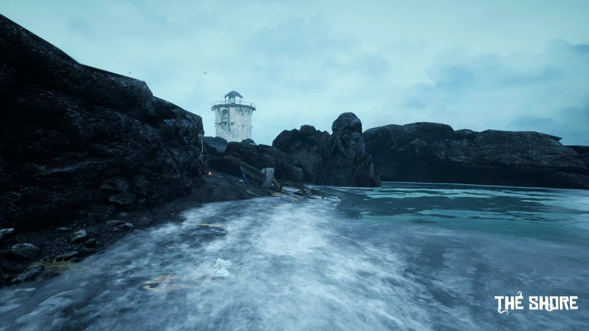 A forgotten island looms shrouded in aggressive fog; its strange ruins hint at a vanished, advanced civilization you seek to understand. Standing on the shore, you finally confront this unsettling landscape where untamed nature actively works against your investigation.