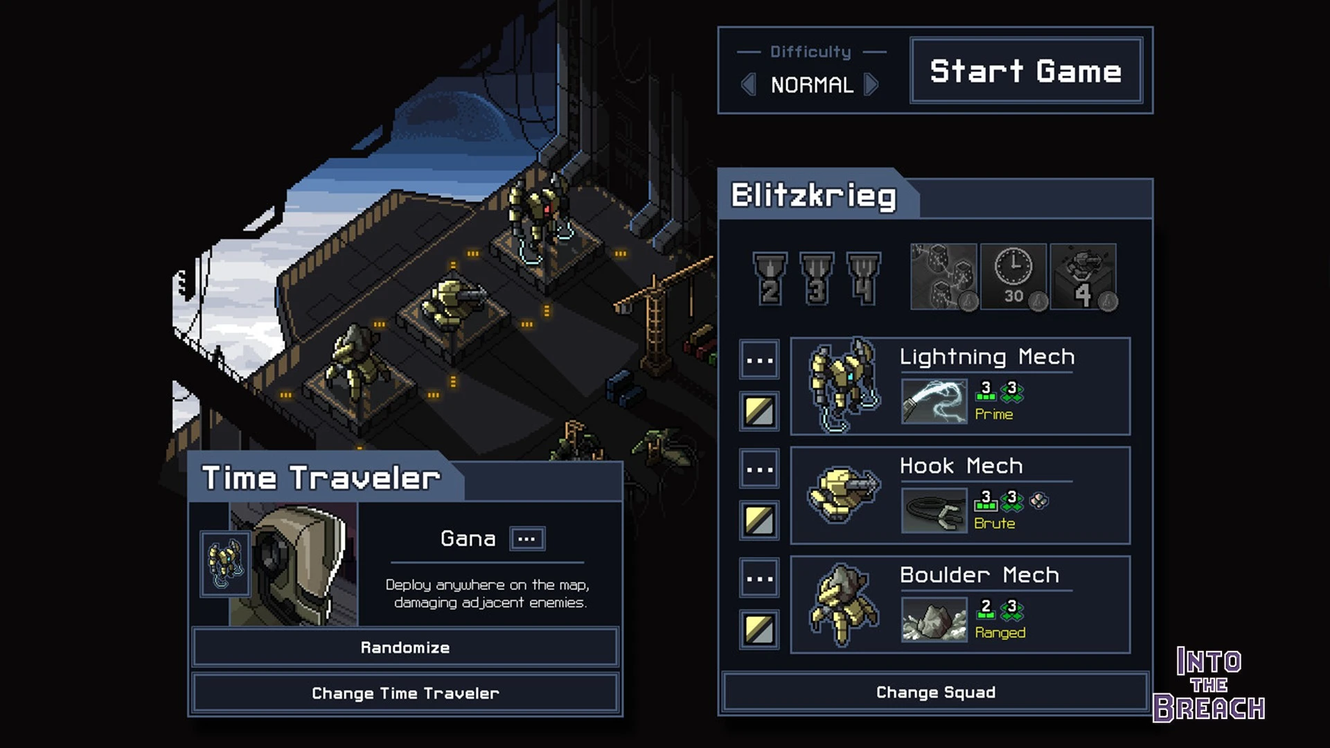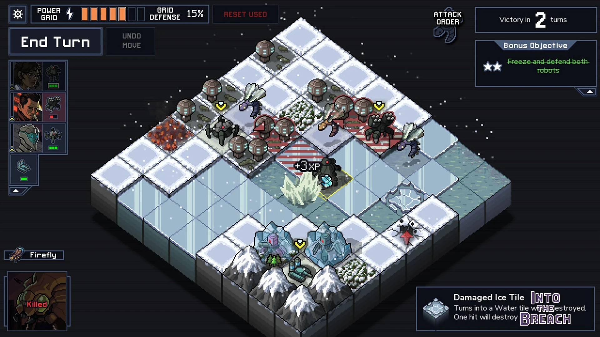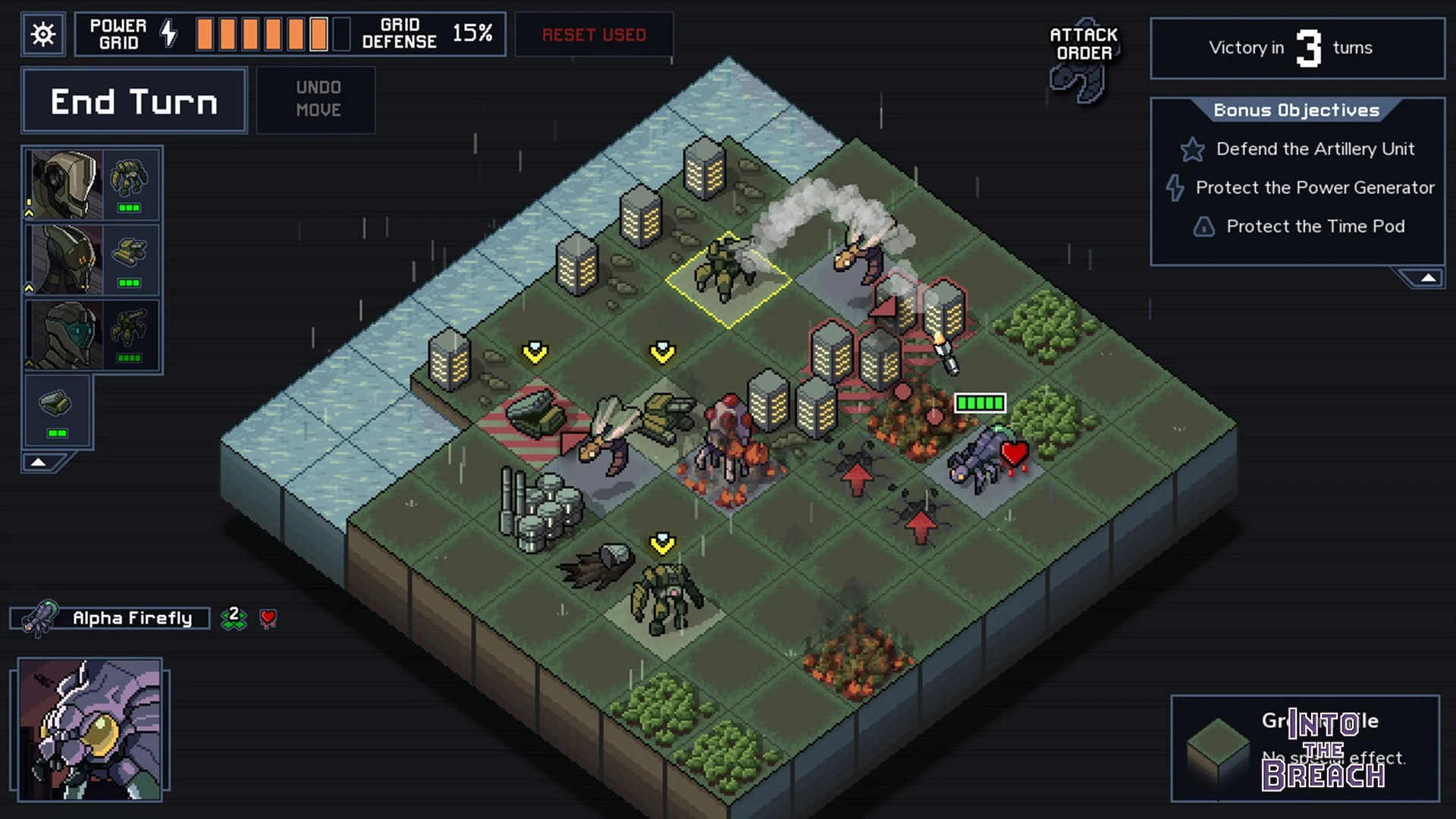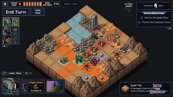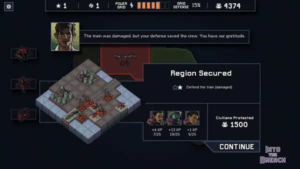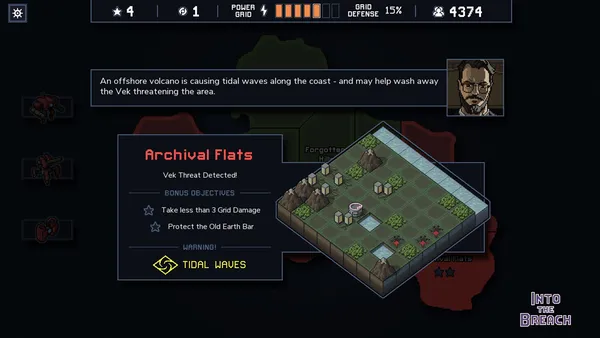 Los restos de la civilización humana sufren el asedio de criaturas gigantescas que emergen de las profundidades. En el título de estrategia Into the Breach, diriges potentes mechas pilotados por viajeros temporales enviados para evitar la extinción de la humanidad. Los combates ocurren en tableros tácticos donde los movimientos enemigos son visibles con antelación, permitiéndote proteger los rascacielos energéticos que alimentan tu tecnología.