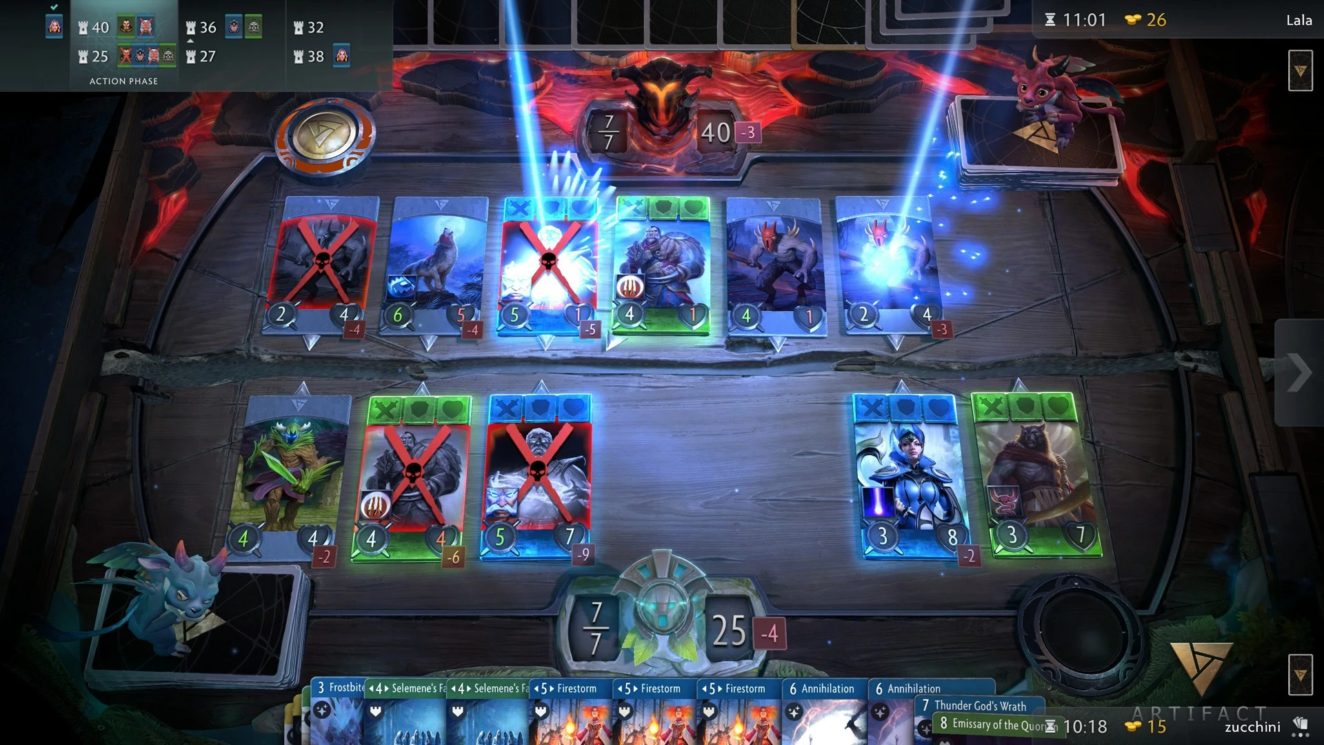 Artifact는 Valve Software가 제작한 Dota 2의 방대한 연대기와 핵심적인 전장 구조를 계승하며 독창적인 카드 대전의 양상을 보여줍니다. 플레이어는 세 갈래로 나뉜 공격로가 유기적으로 맞물려 돌아가는 보드 위에서 다섯 명의 영웅을 배치하고 각 전선의 승세를 세밀하게 조율합니다. 일반적인 카드 전략 게임이 단일 전장에만 주력하는 것과 달리, 이곳에서는 영웅의 부활 주기와 각 라인의 포탑 상태를 살피는 지휘관의 넓은 시야가 승기를 잡는 핵심 요소입니다.