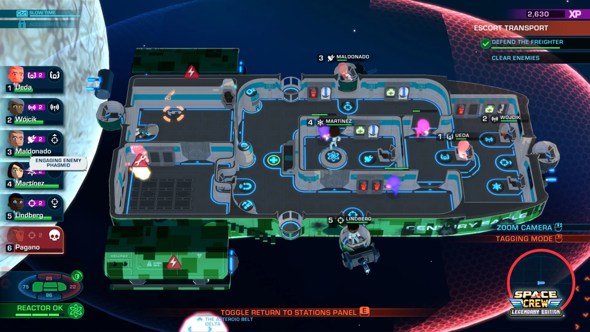 - Назначайте и контролируйте каждого члена экипажа, распределяя задачи между ремонтом и обороной.